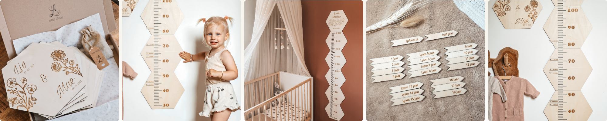 Wil je een écht unieke groeimeter? We kunnen de groeimeter volledig voor je personaliseren. Of het nu gaat om de naam en geboortedatum van je kindje(s), of de achternaam van jullie gezin, het kan allemaal! We hebben een aantal prachtige ontwerpen voor je klaarstaan, maar heb je zelf een creatief idee? Neem gerust contact met ons op, dan maken we samen jouw unieke groeimeter.