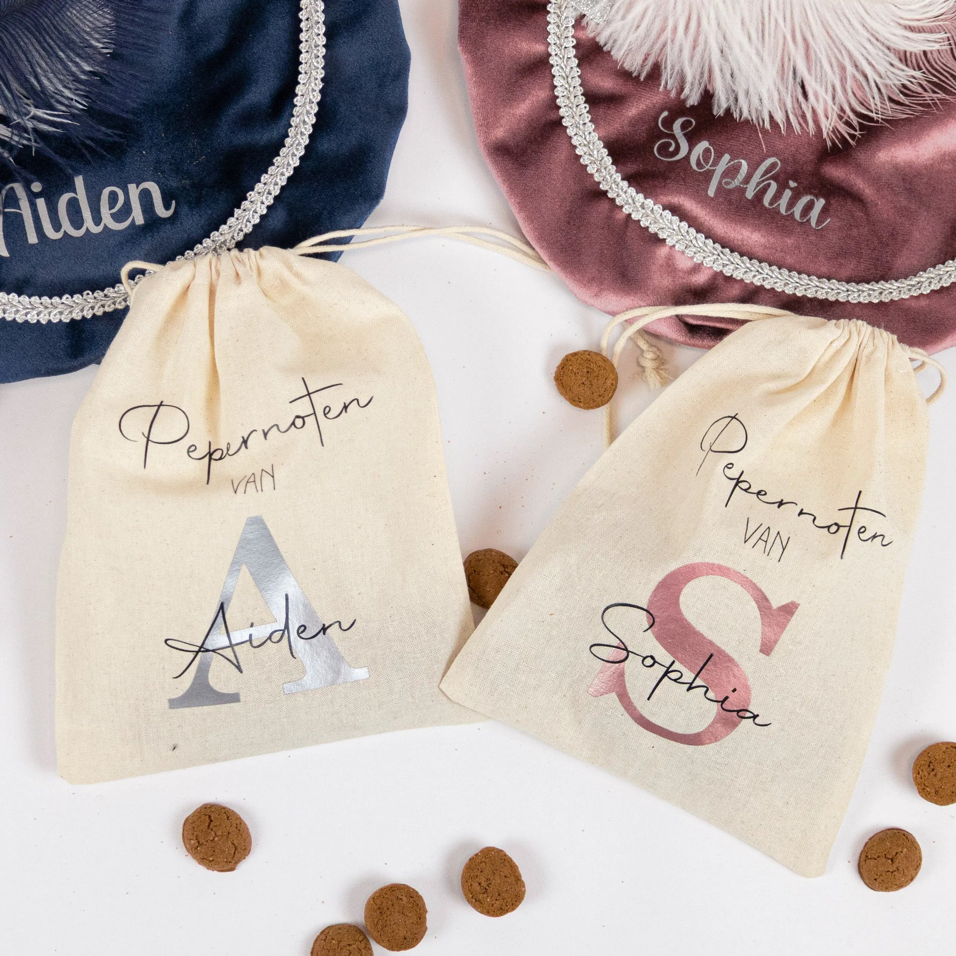 Dit handige linnen zakje is ideaal om je pepernoten en kruidnoten in te bewaren. Het pepernotenzakje wordt bedrukt met naam en een gouden, zilveren of rosé gouden monogram op de achtergrond. Zo ziet iedereen dat het snoepgoed van jou is.